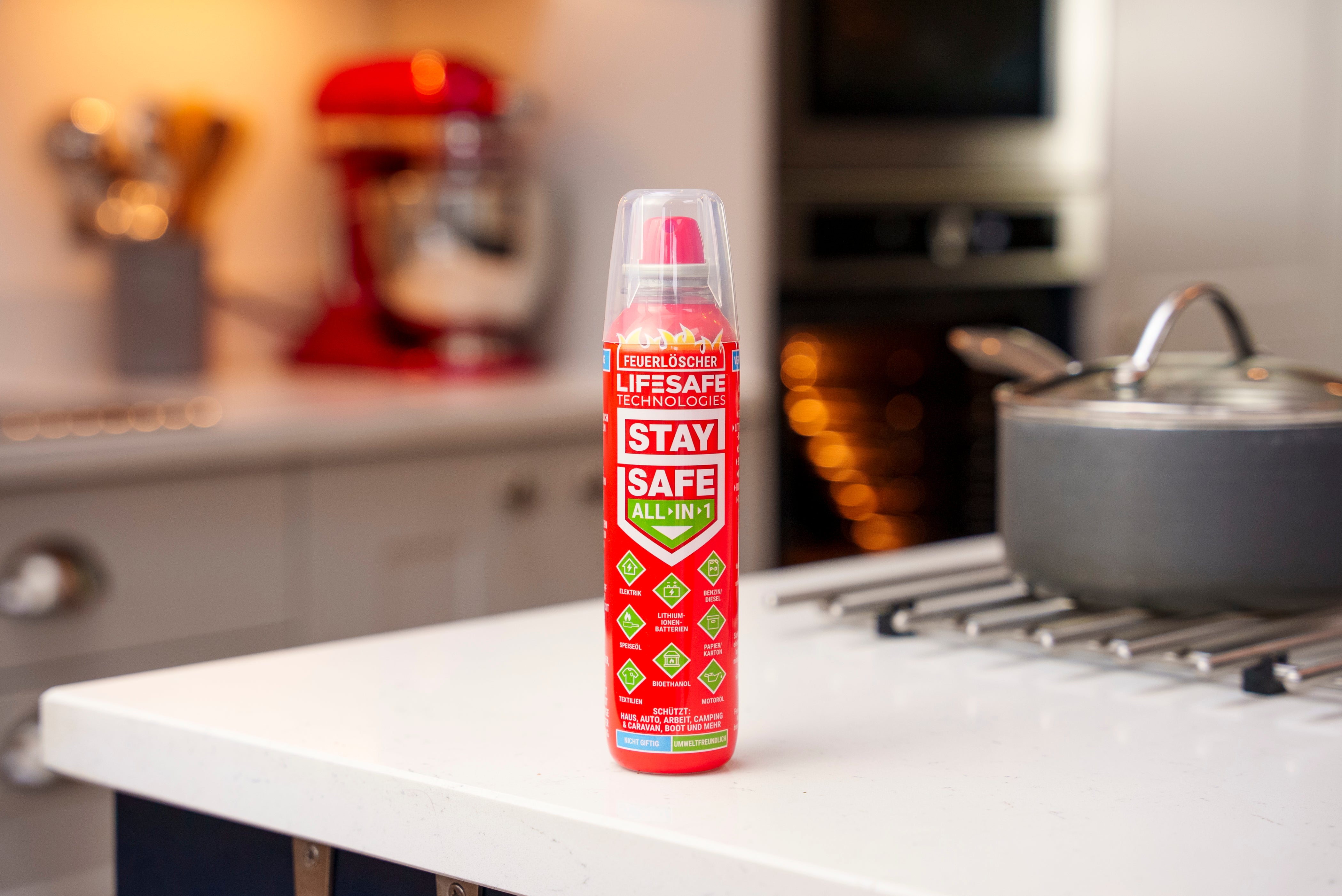 Wir haben auf unserem meistverkauften StaySafe 5-in-1 Feuerlöscher aufgebaut und die nächste Generation StaySafe All-in-1 geschaffen.